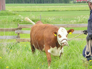 Lehmän kokoinen limousinhieho Muksis sielä aiheutti kaaosta. Se mokoma oli vielä kiimassa ja hyppi toisen melkein yhtä ison blondityttö Berttan selkään. Maitoputket jo notkui, kun Muksis hakkasi päätänsä niihin kahdella jalalla seisoessaan. Mutta jälleen kerran ne kesti. Ei huonoa lasia...